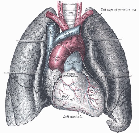 The lung or pulmonary system is the essential respiration organ in all air-breathing animals. In mammals and the more complex life forms, the two lungs are located in the chest on either side of the heart. Their principal function is to transport oxygen from the atmosphere into the bloodstream, and to release carbon dioxide from the bloodstream into the atmosphere.